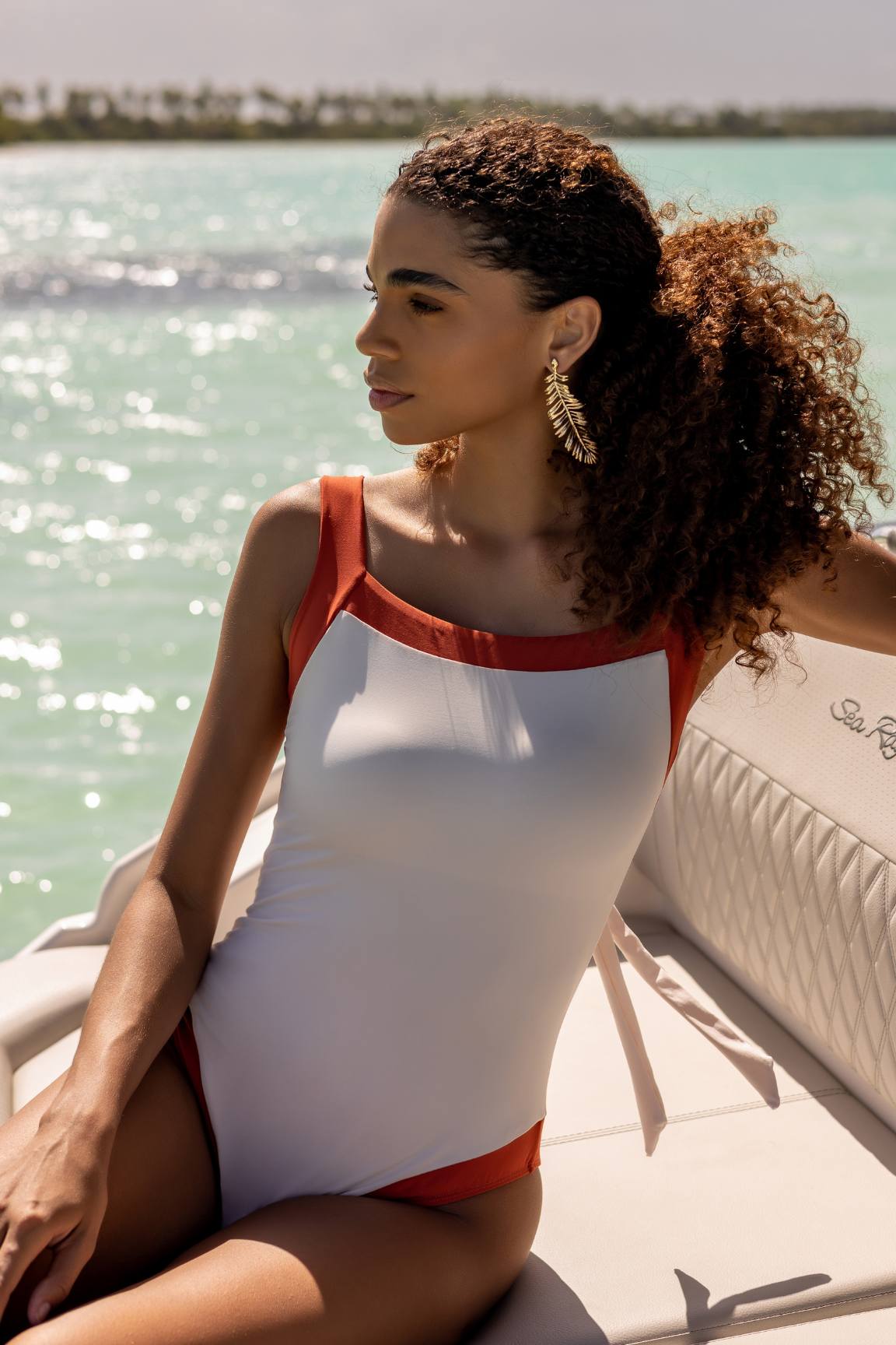 Por tanto, la espalda del bañador blanco y caldera es pronunciada con detalle en las tirantas de argollas para anudar, por lo que facilita el bronceado. Braguita de corte clásico. Efecto reductor.