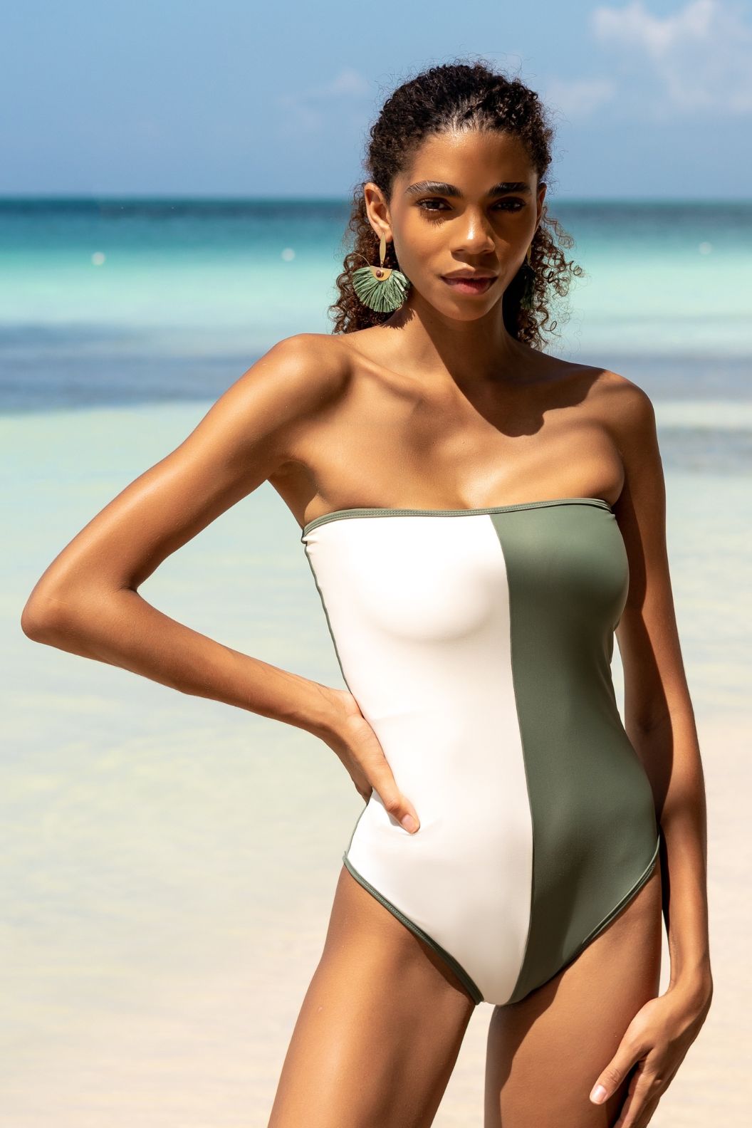 Bañador Verde y Blanco Palabra de Honor Santorini, Gogana; el bañador está confeccionado con tejido elástico en licra en dos colores verde y blanco. El escote de la parte delantera es de forma recta palabra de honor. La parte delantera como la trasera está confeccionada con una pieza bicolor verde y blanco. Lleva forro interior y foam extraíble opcional.