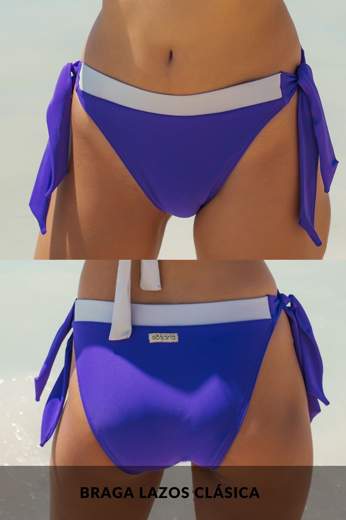 - Braguita Clásica Lazos morados detalles plata Saona: una braguita clásica más cubriente, de corte alto, con lazos anchos.