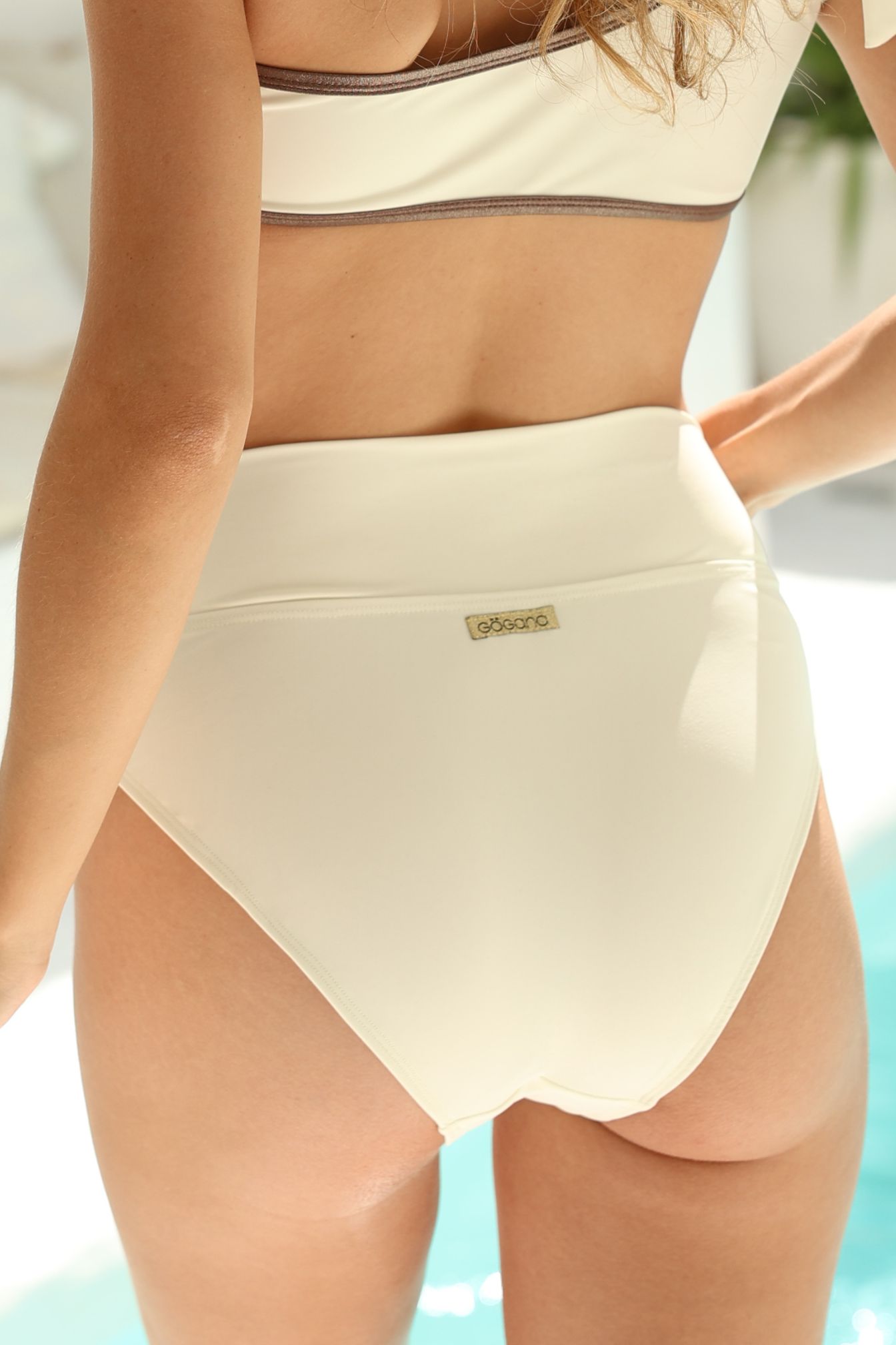 Logo negro y dorado Gogana en el centro de la braguita trasera.
