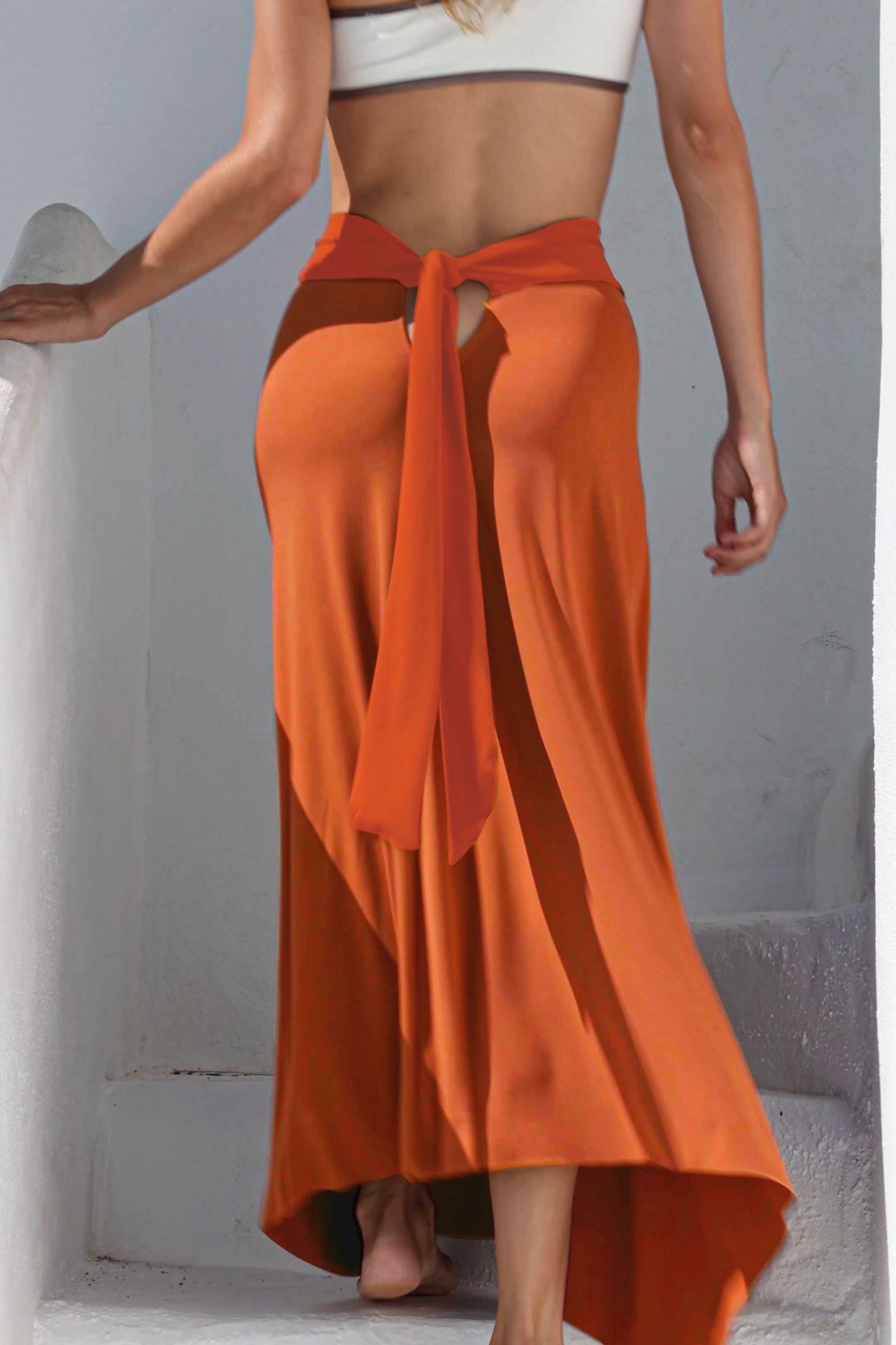 Vestido Falda Naranja Multiposición Mykonos, Gogana; El Vestido Falda Naranja Multiposición está confeccionado con tejido punto de seda en color naranja con cinturilla en color naranja más oscuro en licra. La parte de arriba como la parte de abajo son de una pieza , por lo tanto, garantiza la máxima comodidad. La cinturilla en de color naranja oscuro que se pueden ajustar en cuello y espalda.